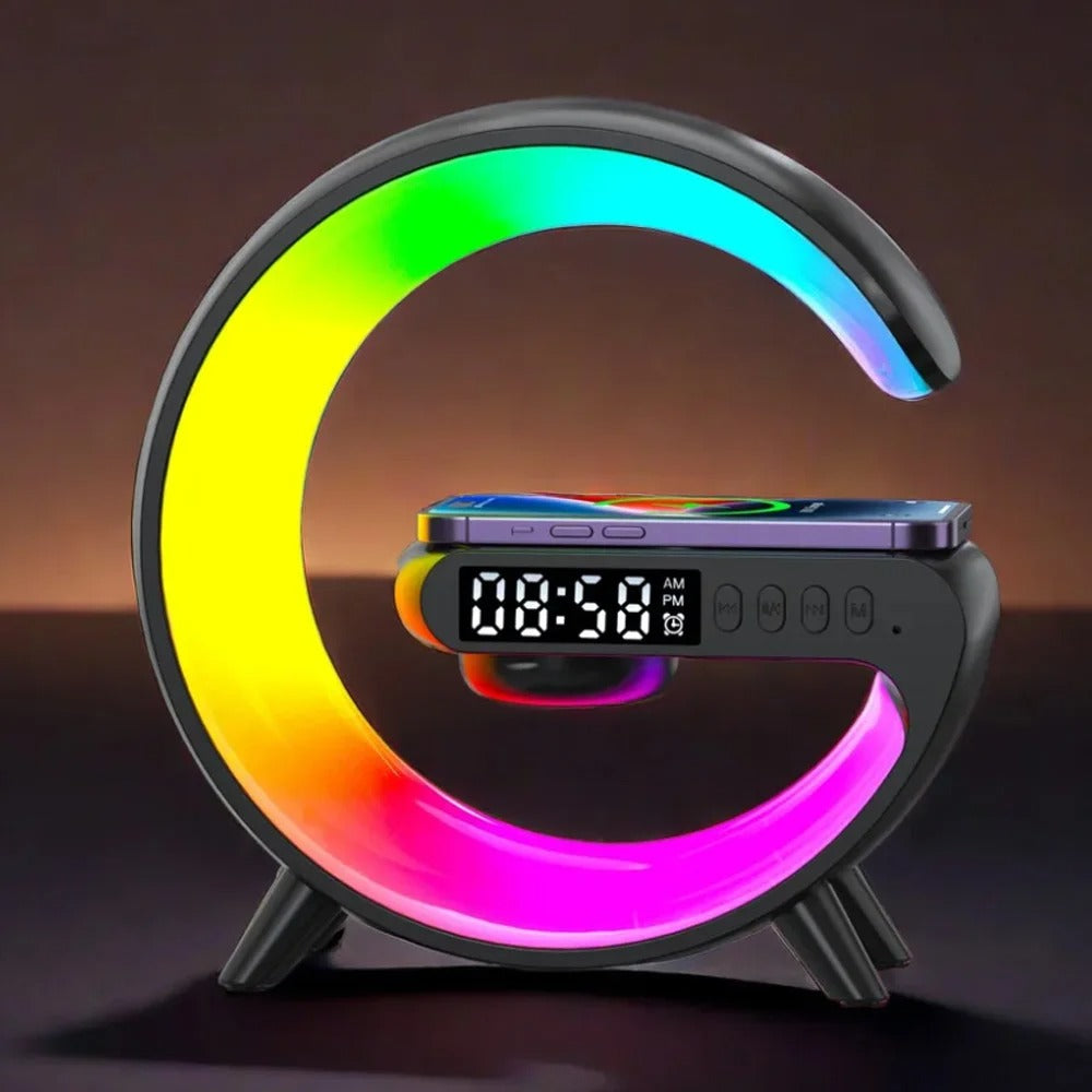 Découvrez notre chargeur sans fil innovant qui combine quatre fonctionnalités pratiques en un seul appareil : chargeur, lumière LED, support et haut-parleur.